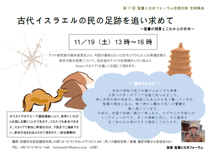 ヤマト研究家の堀井俊男氏より、今回が最終となったイスラエル東遷を追う旅の報告を、在住地のアメリカ合衆国オレゴンよりSkype(スカイプ)を通して行って頂きます。